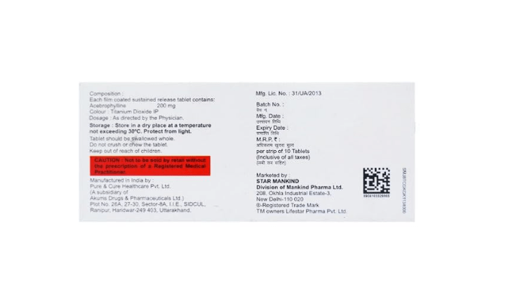 Abiways-200 SR contains Acebrophylline, a bronchodilator and mucoregulator used to manage chronic respiratory conditions. The SR (Sustained Release) formulation ensures a slow and steady release of the medicine in the body, providing long-lasting relief from symptoms.