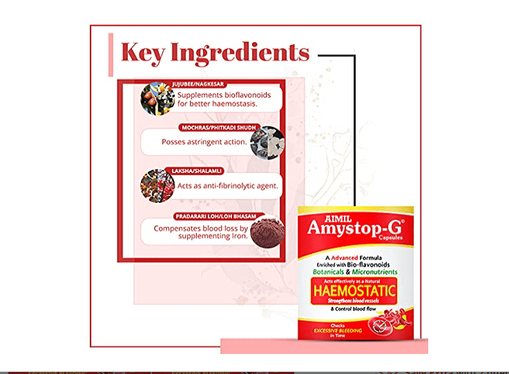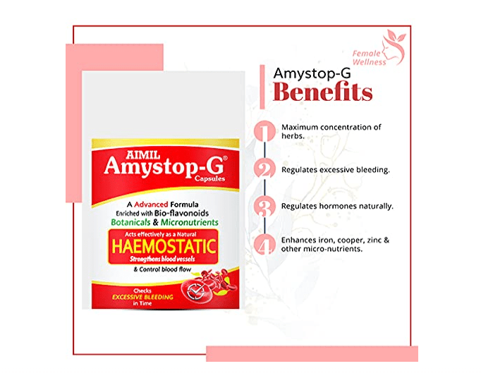 Amystop-G Capsule is a non-hormonal formulation containing bioflavonoids and other herbal extracts. Bioflavonoids may help to enhance the overall health of the reproductive organs of women. It may also exert anti-inflammatory activity and restore the hormonal balance in females.