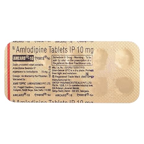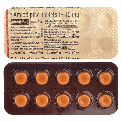 Amcard-10 contains Amlodipine Besilate IP, equivalent to Amlodipine 10 mg, formulated as uncoated oral tablets. Amlodipine is a long-acting dihydropyridine calcium channel blocker widely used in the treatment of hypertension and angina. This higher-strength 10 mg dose is typically prescribed when a stronger therapeutic response is required, helping deliver effective and sustained control of blood pressure and improving blood flow to the heart.