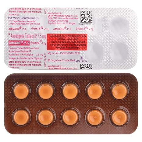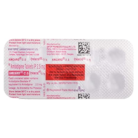 Amcard-2.5 contains Amlodipine, a long-acting dihydropyridine calcium channel blocker used for the management of hypertension and certain types of angina. At the 2.5 mg strength, the medicine provides controlled vasodilation by blocking calcium entry into vascular smooth muscle. This relaxation of peripheral arteries helps lower systemic vascular resistance, contributing to mild and steady blood pressure reduction.