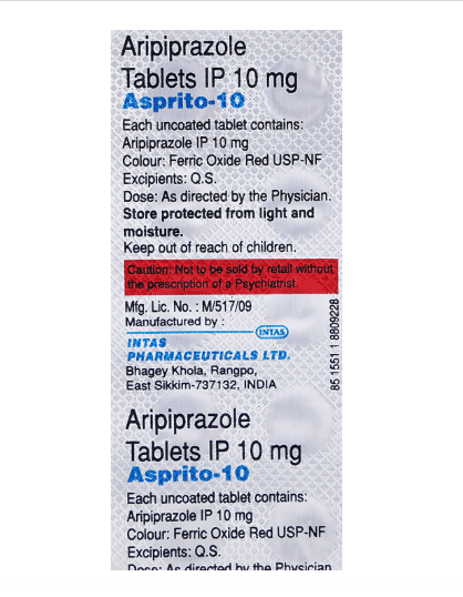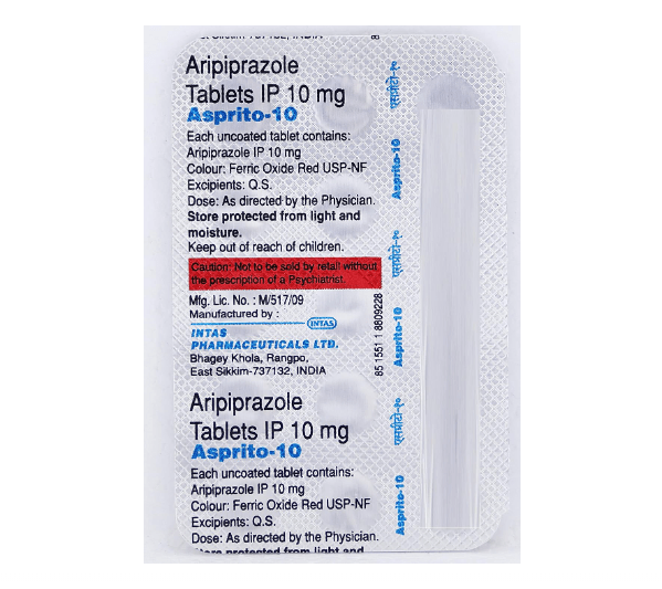 Asprito-10 Tablet contains Aripiprazole 10 mg per tablet and belongs to the class of atypical antipsychotic medicines. It is primarily used to treat psychiatric conditions related to disturbances in mood, behaviour, perception, and thinking. Aripiprazole is known for its unique mechanism of action, which helps stabilize both excessive and deficient dopamine activity in the brain.