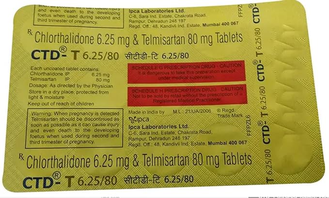 CTD-T 6.25/80 is a fixed-dose combination antihypertensive medication containing Chlorthalidone 6.25 mg and Telmisartan 80 mg. It is designed for the treatment of high blood pressure (hypertension) in patients who require stronger control, especially when monotherapy is insufficient. By combining a diuretic and an angiotensin receptor blocker (ARB), this medicine provides enhanced, long-lasting, and stable blood pressure reduction.