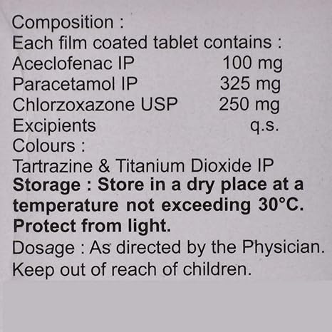 It contains Aceclofenac, Paracetamol, and Chlorzoxazone, which together help reduce pain, swelling, and muscle stiffness while improving mobility.