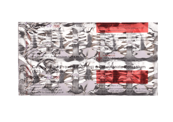 Doxcef CV 200 is a broad-spectrum antibiotic that combines Cefpodoxime (a third-generation cephalosporin) and Clavulanic Acid (a β-lactamase inhibitor). This combination is used to treat a variety of bacterial infections such as respiratory tract infections, urinary tract infections, ear, nose, throat infections, skin infections, and soft tissue infections.