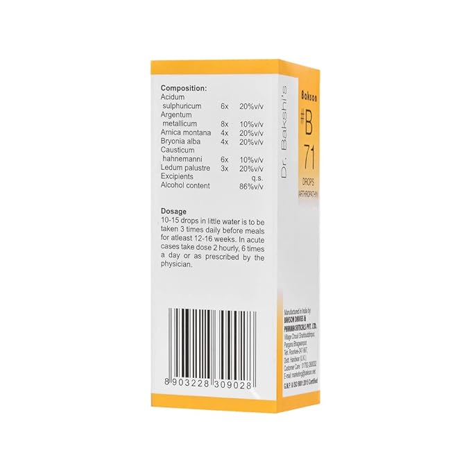 Bakson’s B71 Arthropathy Drops is a homeopathic formulation designed to help relieve joint pain, inflammation, stiffness, and restricted movement associated with arthritis and rheumatic joint conditions. It acts on painful and swollen joints, helps reduce discomfort during movement, and supports overall joint flexibility.