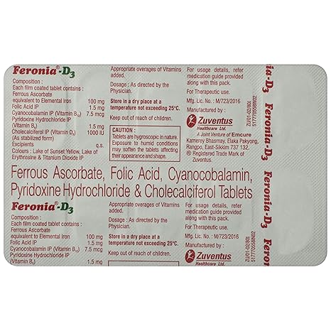 Feronia-D3 is a comprehensive haematinic and nutritional supplement formulated to help in the prevention and treatment of iron-deficiency and nutritional anemia. It combines iron with essential B-complex vitamins to support healthy red blood cell formation and overall vitality.