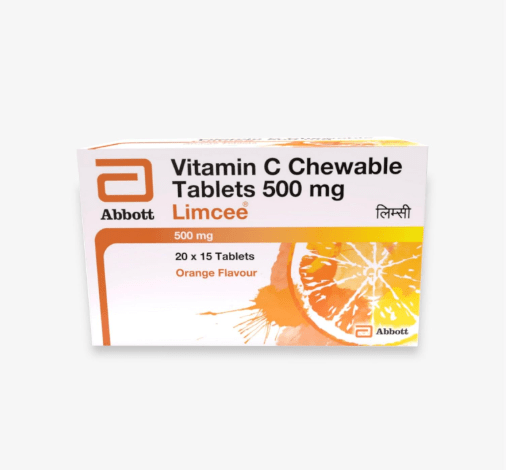Limcee Chewable Tablets provide 500 mg of Vitamin C in a tasty orange flavour. Each tablet contains Ascorbic Acid (100 mg) and Sodium Ascorbate (400 mg) to help boost immunity, support skin health, and protect against oxidative stress. Suitable for men and women.