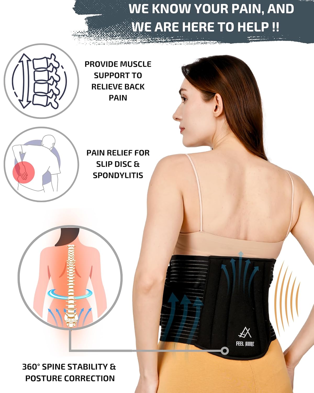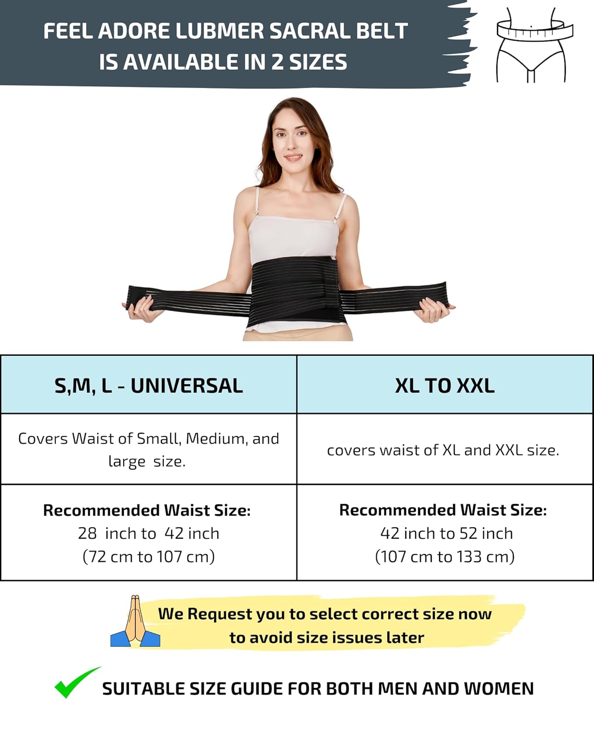 - ✅COMFORTABLE & LONG LASTING: Unlike other waist belts the Feel Adore lumber sacro support belt don’t lose its elasticity over time. This LS belt will provide back support for longer duration of time without getting loose. this lumbo sacral belt men and women ensures 360° spinal support, preventing excess muscle rolling and relieving kamar dard ensuring confort throughout the day.