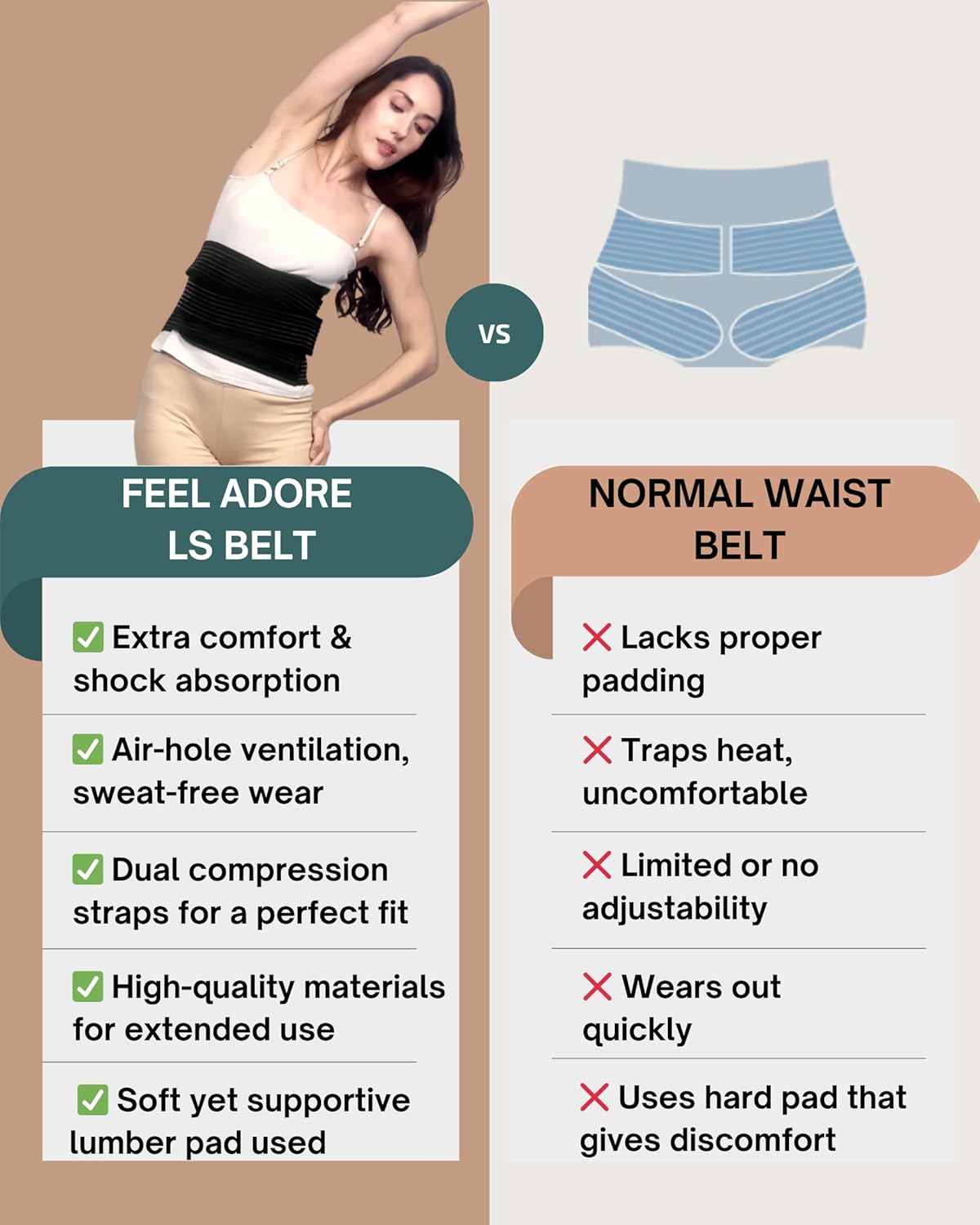 - ✅ULTIMATE LUMBAR SUPPORT FOR BACK PAIN RELIEF: Feel Adore lumbo Sacral LS belt provides immediate comfort and reduces pressure on the lower back, helping with sciatica, spine posture correction, herniated discs (slip disc), and lumbar pain caused by prolonged sitting or standing. The back brace support belt preventing excessive rolling of muscles and provide therapeutic relief to the lumbar spine.