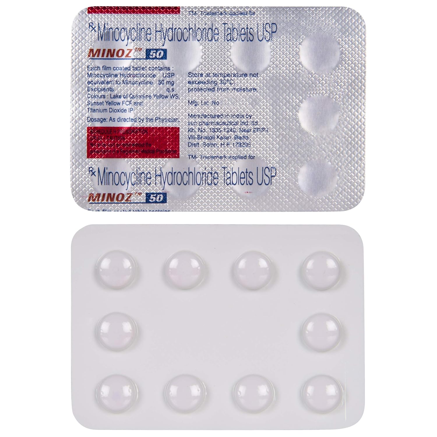 Minoz 50 is a prescription oral tablet that contains Minocycline Hydrochloride USP, therapeutically equivalent to Minocycline 50 mg. Minocycline is a broad-spectrum antibiotic belonging to the tetracycline class. It has bacteriostatic activity and is effective against a variety of Gram-positive and Gram-negative bacteria.