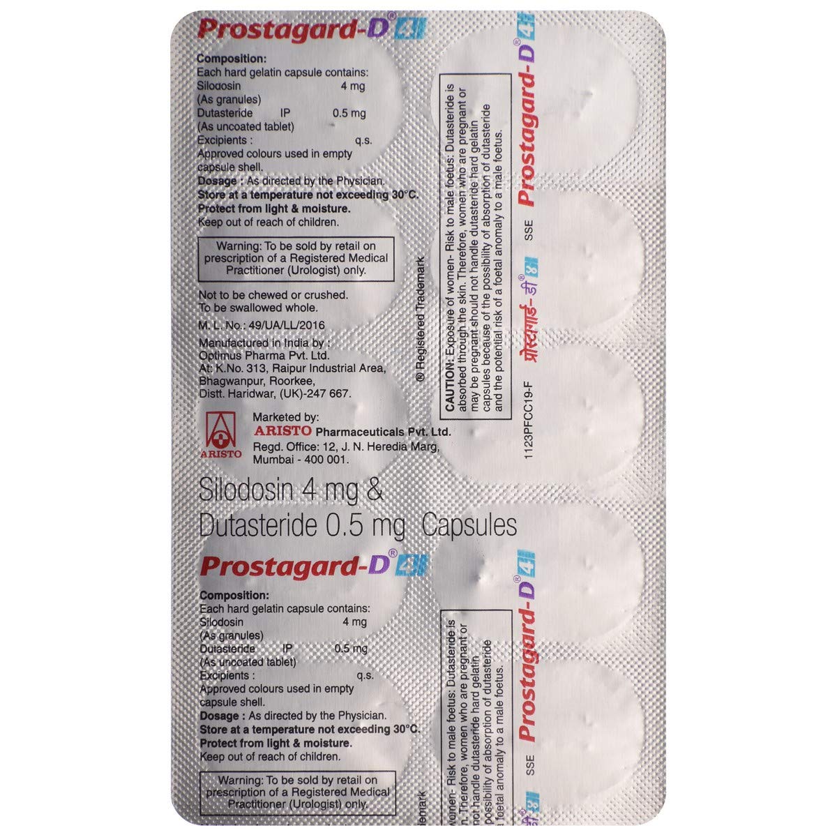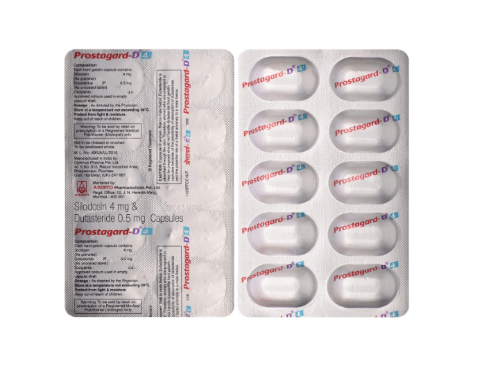 Prostagard-D 4 is a combination therapy used for the management of Benign Prostatic Hyperplasia (BPH), a condition where the prostate gland enlarges and obstructs normal urine flow. The medication combines the benefits of an alpha-blocker (Silodosin) and a 5-alpha reductase inhibitor (Dutasteride) to provide both immediate and long-term relief from urinary symptoms.