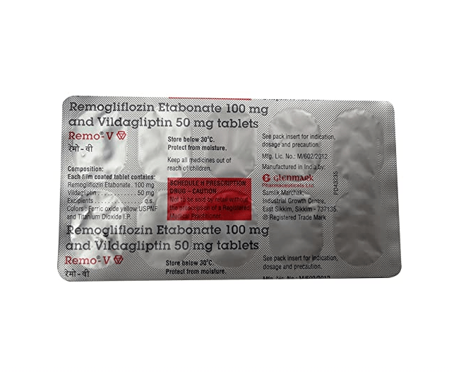 Remo V 100/50 mg Tablet is a combination oral hypoglycemic agent used for the management of type 2 diabetes mellitus. It contains Remogliflozin Etabonate 100 mg and Vildagliptin 50 mg per tablet. The combination provides dual action to help control blood sugar levels effectively in patients whose blood glucose is not adequately managed with diet, exercise, or monotherapy.