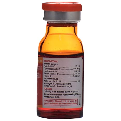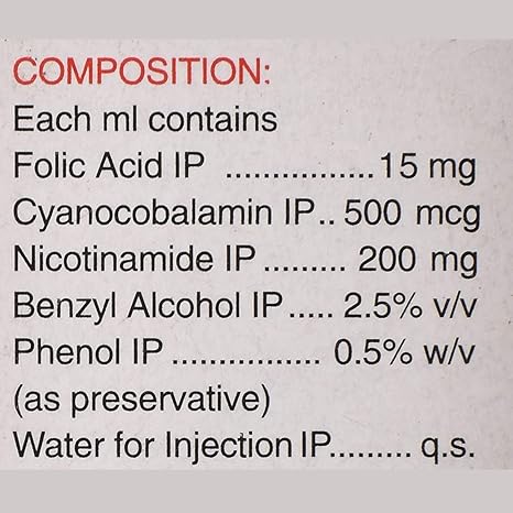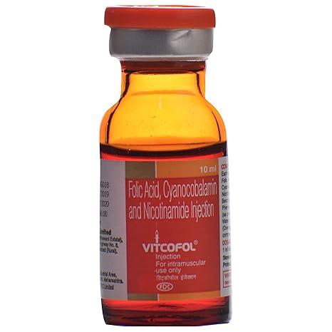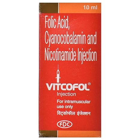 Vitcofol Injection is a multivitamin formulation enriched with essential hematinic and neurotropic vitamins. It is primarily used to treat anemia, nutritional deficiencies, and neurological disorders arising from inadequate levels of folic acid, Vitamin B12, and nicotinamide. The injectable form ensures faster absorption and effective correction of deficiencies.